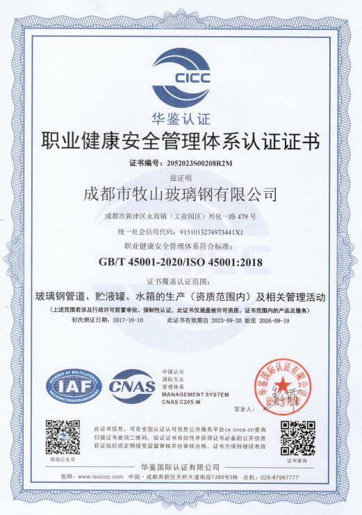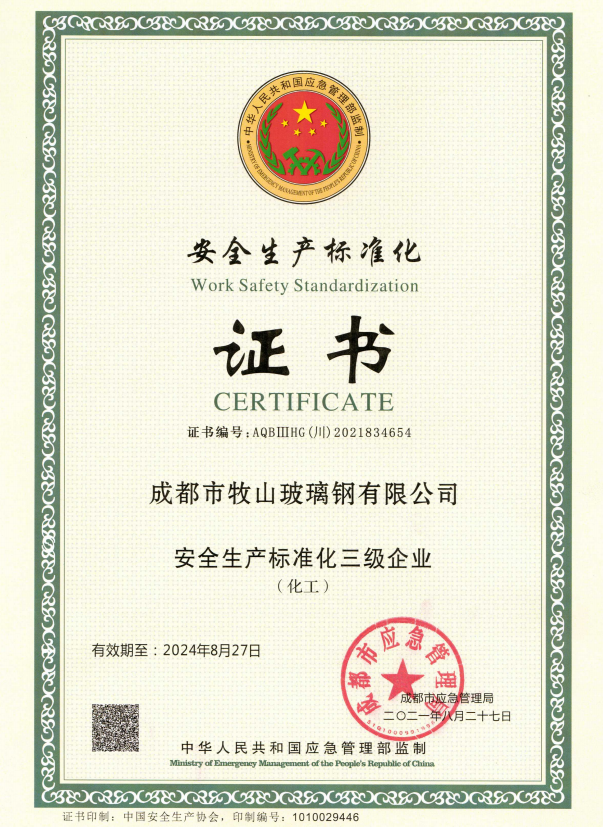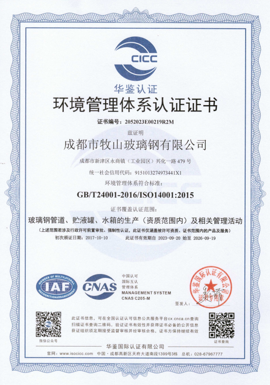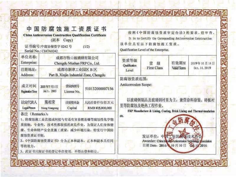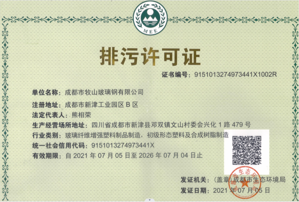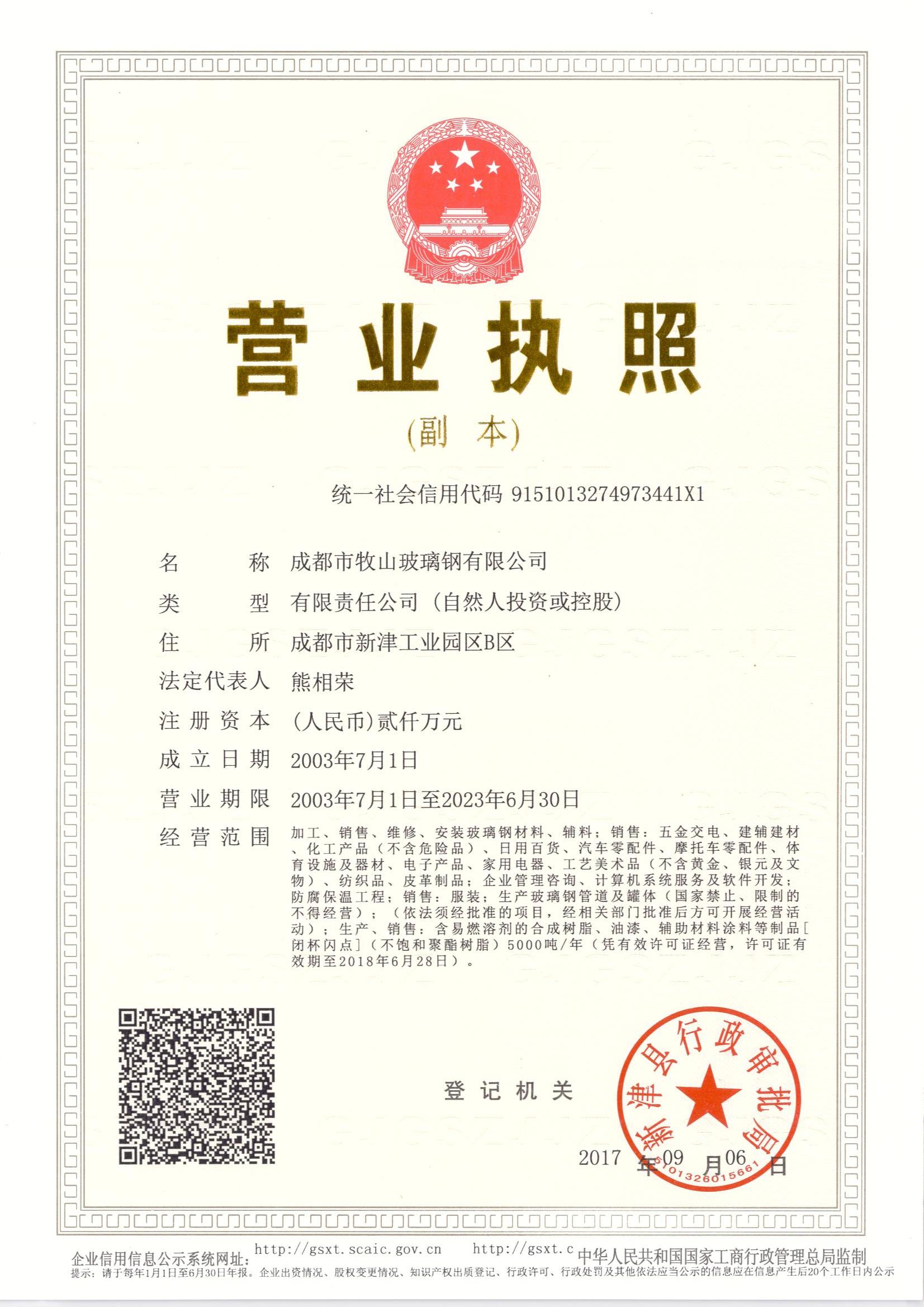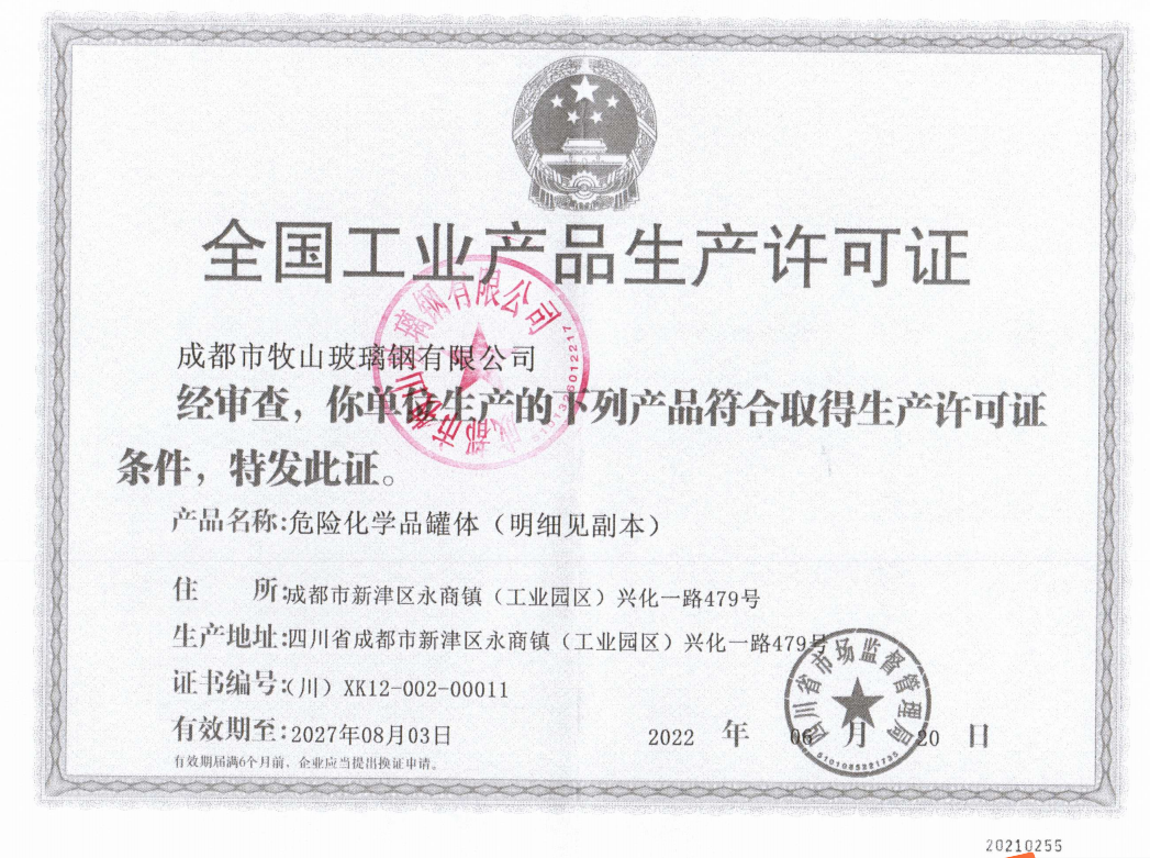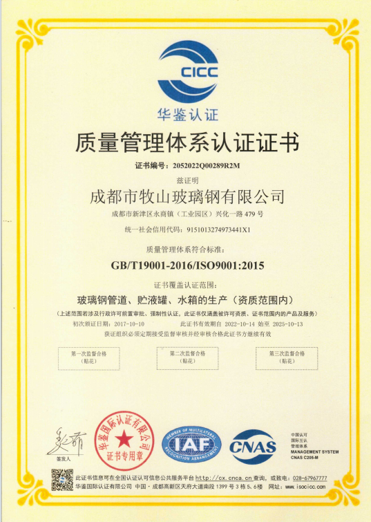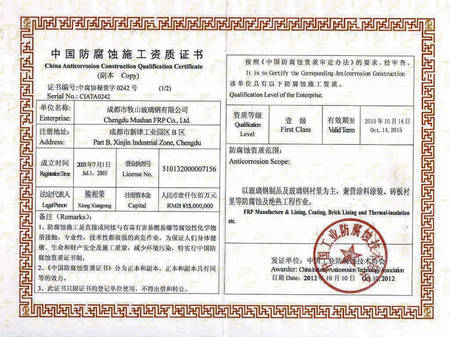 公司于2004年通過(guò)ISO9001:2000質(zhì)量管理體系認(rèn)證,具有國(guó)家質(zhì)量監(jiān)督檢驗(yàn)檢疫總局頒發(fā)的容器(化工儲(chǔ)罐)《生產(chǎn)許可證》,玻璃鋼夾砂管道《生產(chǎn)許可證》,玻璃鋼水箱和玻璃鋼管道的《涉及飲用水衛(wèi)生安全的衛(wèi)生許可批件》,是中國(guó)玻璃鋼協(xié)會(huì)會(huì)員單位,具有玻璃鋼防腐工程壹級(jí)資質(zhì),“牧山”商標(biāo)被評(píng)為《成都市著名商標(biāo)》......