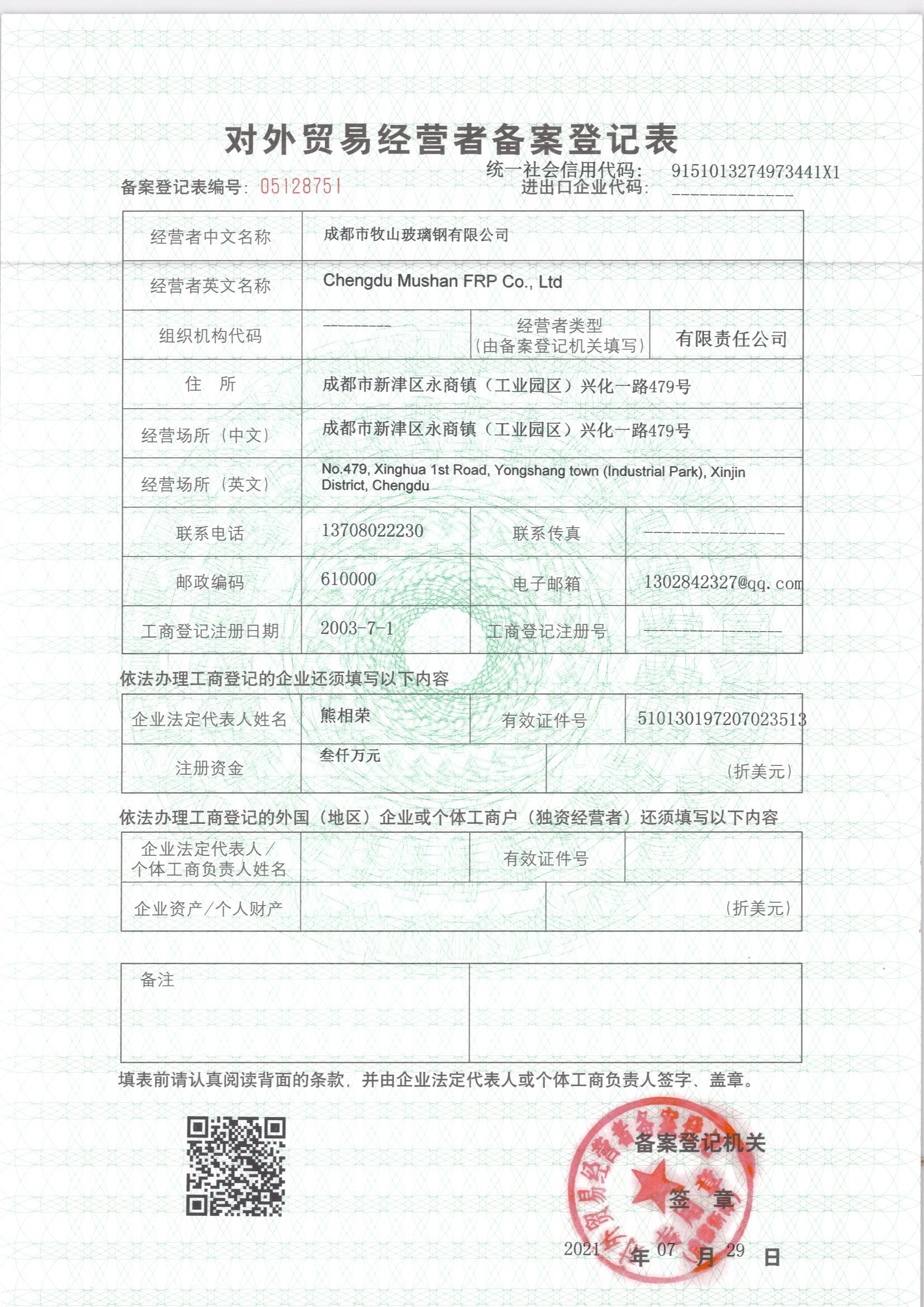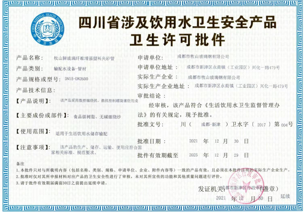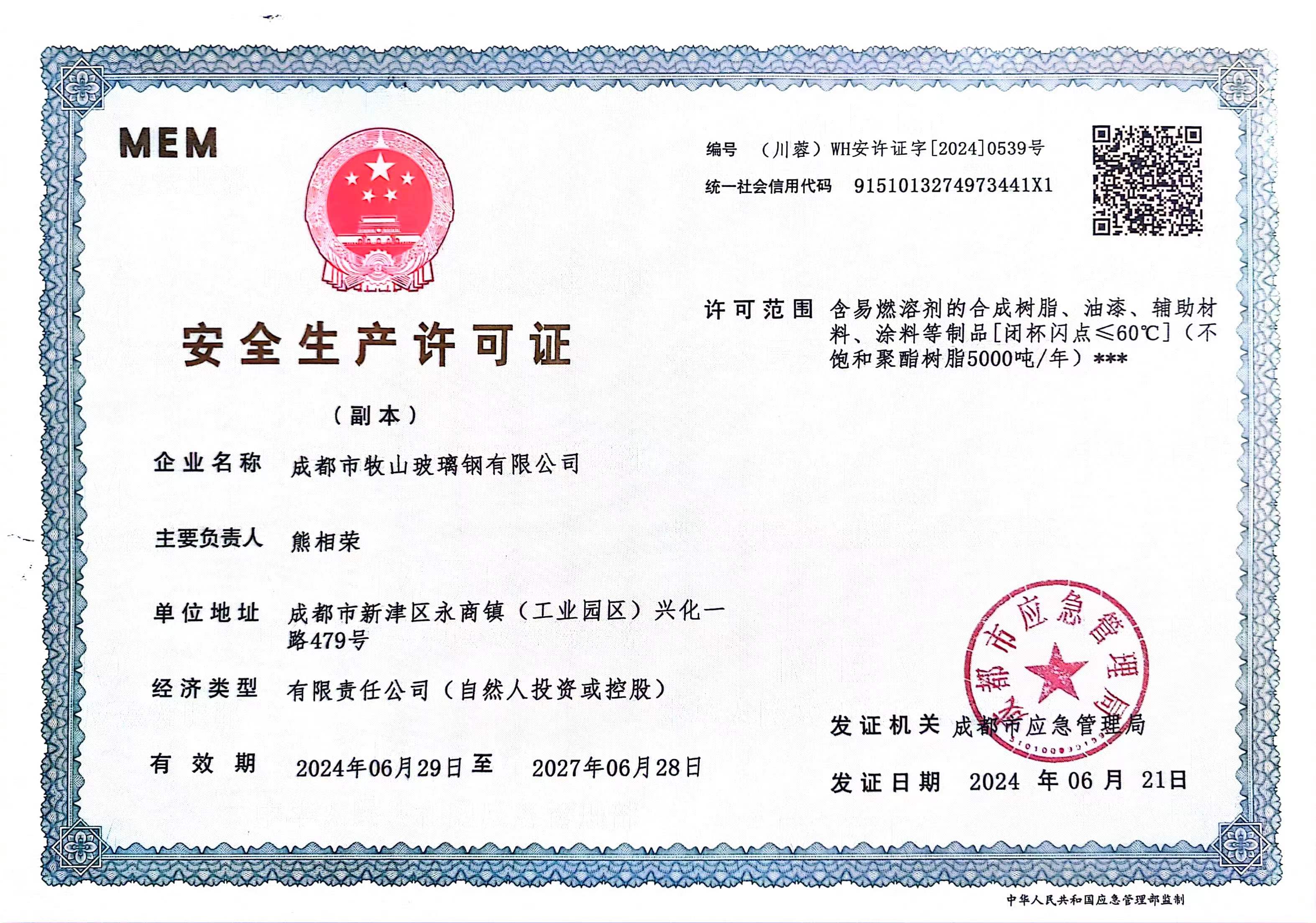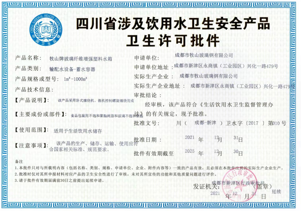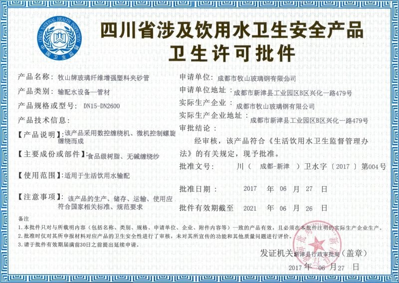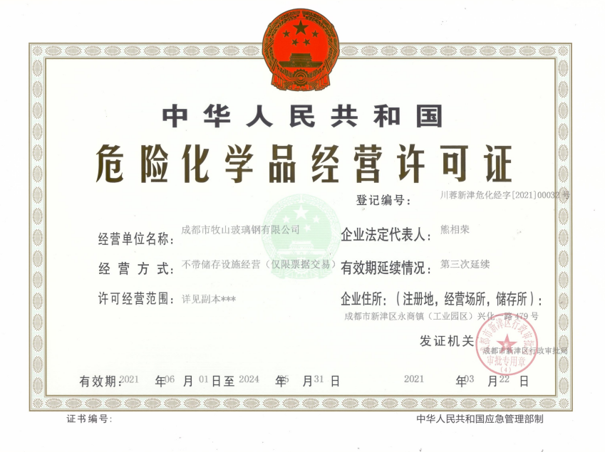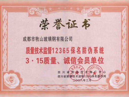 公司于2004年通過(guò)ISO9001:2000質(zhì)量管理體系認(rèn)證,具有國(guó)家質(zhì)量監(jiān)督檢驗(yàn)檢疫總局頒發(fā)的容器(化工儲(chǔ)罐)《生產(chǎn)許可證》,玻璃鋼夾砂管道《生產(chǎn)許可證》,玻璃鋼水箱和玻璃鋼管道的《涉及飲用水衛(wèi)生安全的衛(wèi)生許可批件》,是中國(guó)玻璃鋼協(xié)會(huì)會(huì)員單位,具有玻璃鋼防腐工程壹級(jí)資質(zhì),“牧山”商標(biāo)被評(píng)為《成都市著名商標(biāo)》......